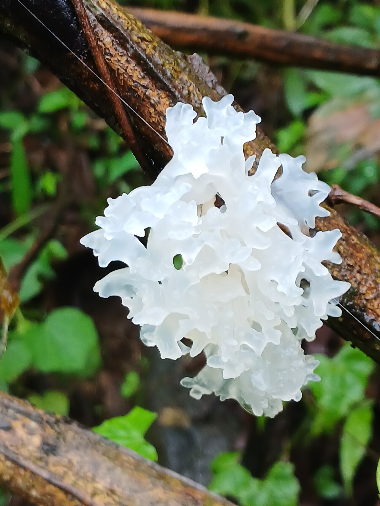 A stunning white, translucent, frilly jelly fungus that looks like underwater coral growing on dead wood. Snow Fungus is a $1 billion+ industry in China, where it's a staple ingredient in sweet dessert soups and a rising star in skincare products. Like its cousin Witch's Butter, it's actually a mycoparasite — feeding on Annulohypoxylon fungi, not wood.